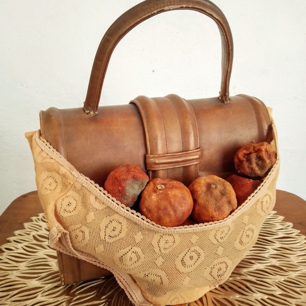 Escultura (bolso de cuero, bragas acrílicas, mandarinas)