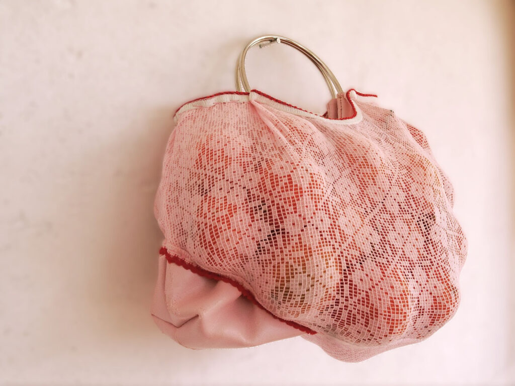 sculpture (Braga rosa, Bolso de piel sintética, mandarinas)